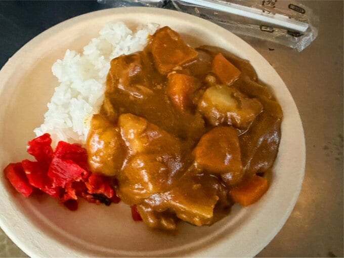 11/18、新潟県村上市小岩内地区のみなさまが、もとやスーパーさんにて小岩内地区の新米を使ったカレーライスと、コールスローサラダをご用意してくださいました。これまでは炊き出しでしたが、復興フェーズに合わせていただき、有料での提供です。