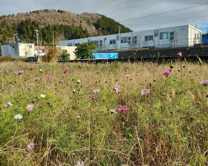 また、9月の草刈りの際に播いた種が芽吹き、寒空のなか、コスモスが花を咲かせました。