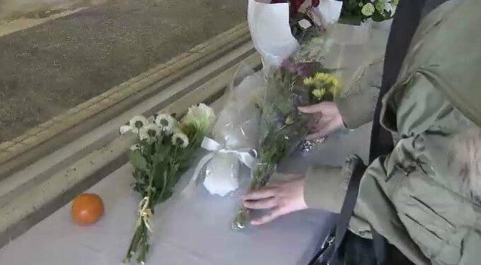献花した親子:「この子がまだ歩かないうちからお散歩コースで来ていたので…悲しい」