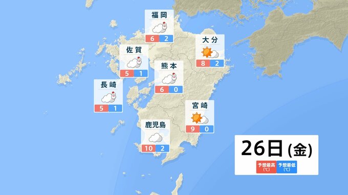 九州は雨のクリスマスとなりました、しかし、この雨を境に「強い寒気」が南下して雪に変わりそうです。11時発表の予報で、26日(金)福岡県・佐賀県・長崎県・熊本県に『雪の予報』が発表されました。
