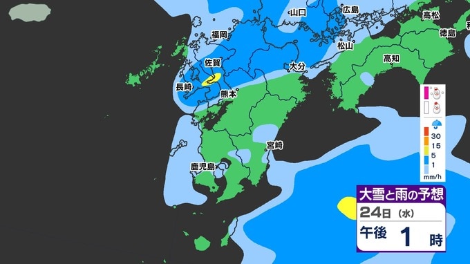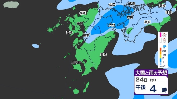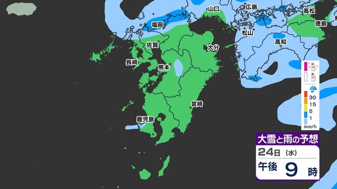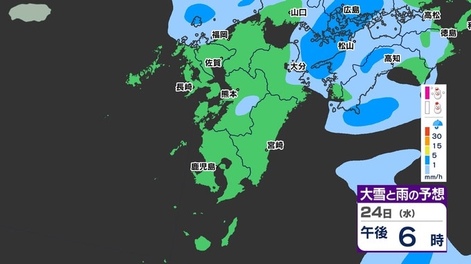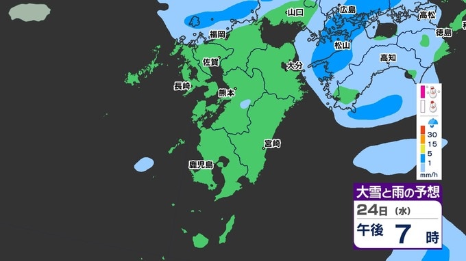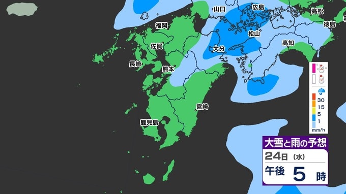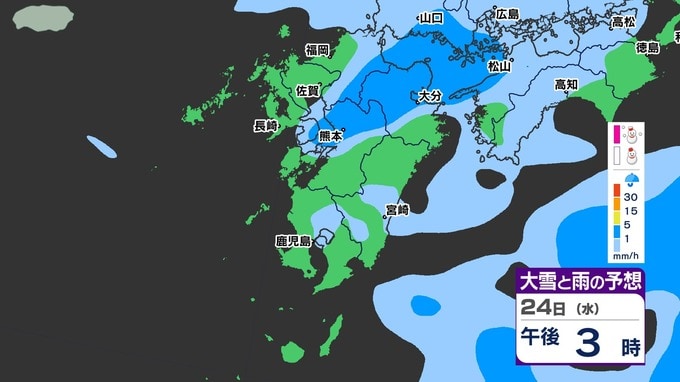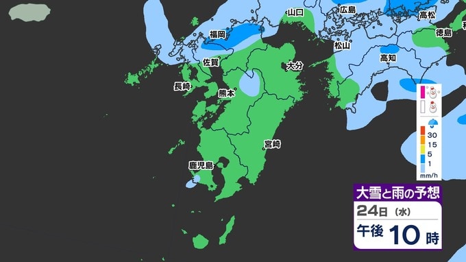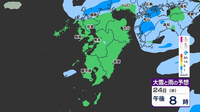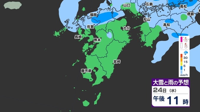 24日(水)25日(木)は「雨」の予想ですが、26日(金)には白い表示の「雪」の予想も出てきます。福岡県では、