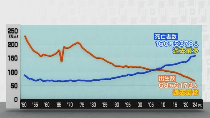 去年生まれた赤ちゃんは68万6173人と過去最低に。一方、亡くなった人は160万5378人と、過去最多。日本の人口はこの1年で差し引き90万人も減りました。人口減少問題にどう対処すべきか、出口は見えていません。