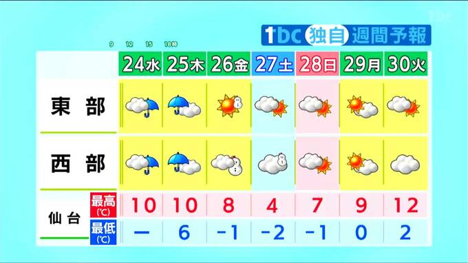 金曜日以降は、強い寒気が流れ込んできます。金曜日は西部で断続的に雪が降る見込みです。東部は晴れ間が出ますが、夕方以降は強い寒気の影響で雪雲が流れ込んでくる可能性があります。金曜日の夕方から土曜日にかけては、スリップなどに注意が必要です。土曜日は厳しい寒さとなる見込みです。