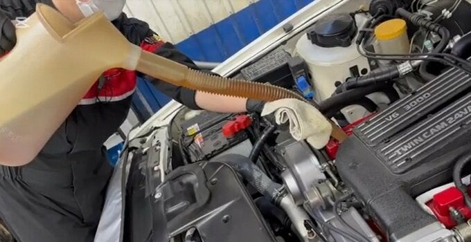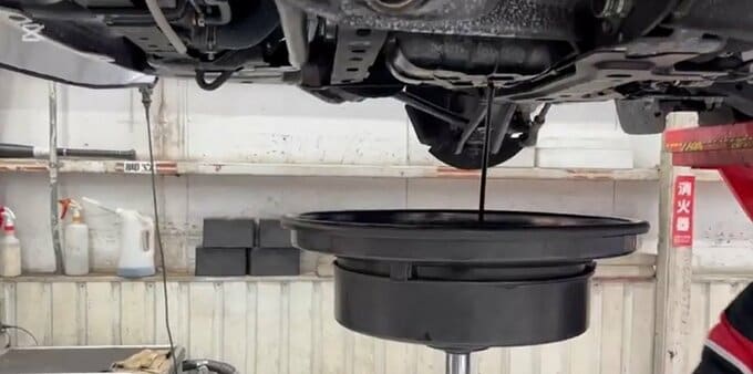 続いてエンジンオイルの交換作業へ。排出される真っ黒なオイルを見た伊藤さんは、「半年たつと、真っ黒ですね」と素直な感想を口にしました。整備士はオイルを「人間で例えて血液と一緒」と表現。抜き取られた古いオイルは、専門の業者に回収を依頼するとのことです。