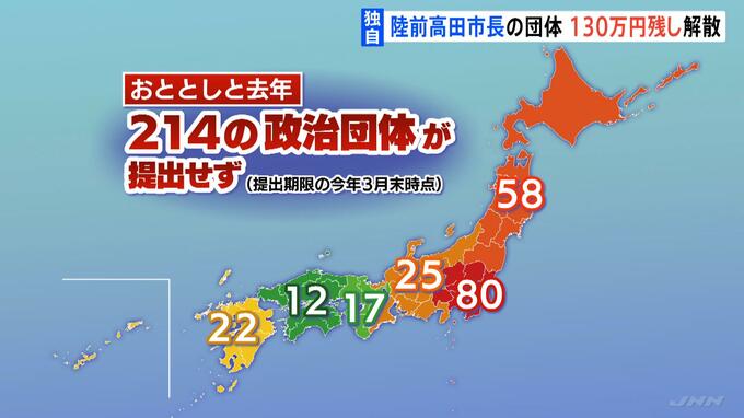 JNNがこれまでに取材したところ、今年3月末時点で報告書を2年連続提出していなかった地方議員などの政治団体は214で、関係する地方議員は198人、首長は3人でした。政党所属議員では自民31人、立憲8人、共産6人、維新7人、国民1人、無所属145人となっています。