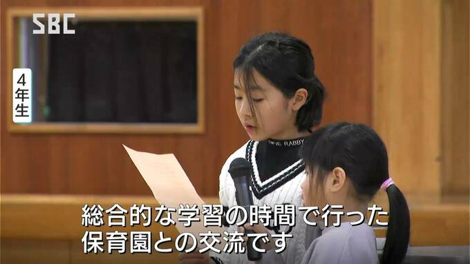 児童代表4年生「総合的な学習の時間で行った保育園との交流です。私は渚保育園チームで保育園児たちがどんな遊びが好きで、どんなことをしようかといろいろなことを考えました」