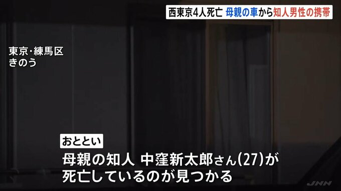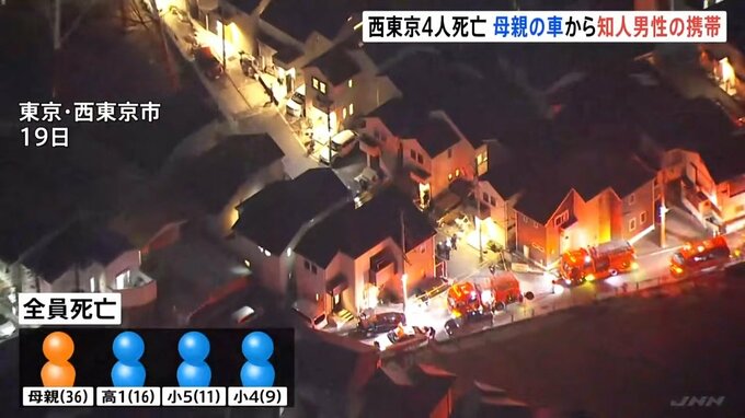 東京・西東京市の住宅で母親と子どものあわせて4人が死亡した事件。その後、別のマンションの一室で死亡しているのが見つかった知人男性の携帯電話が、母親の車の中から発見されたことが新たに分かりました。