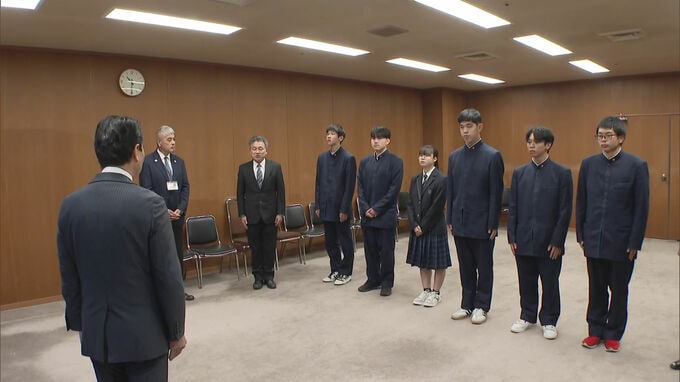 24日午前、福岡県庁を訪れたのは、ハワイ沖での航海実習を終えた福岡県立水産高校海洋科の2年生です。