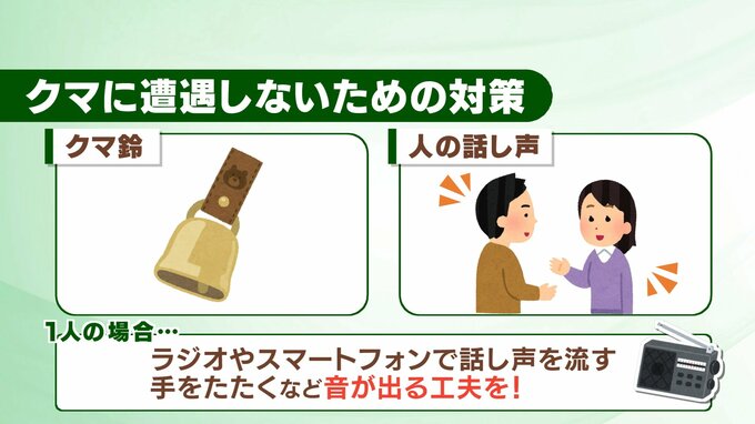 望月准教授によると、遭遇しないようにするためには、多くのクマは人間を恐れているため、まずは「音」で人の存在を知らせることが重要です。例えば「クマ鈴」また「人の話し声」も有効と言われています。もし1人でいる場合は、ラジオやスマートフォンで「人の話し声」を流す、また、手を叩くなど音が出る工夫をしてほしいということです。