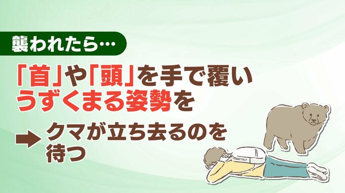 万が一襲われた時は、クマは、はじめに人の顔や頭を狙ってきます。致命傷となる首や頭を手で覆い、うずくまる姿勢でクマが立ち去るのを待つことが有効的だということです。