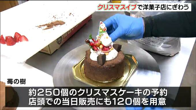 この店では、約250個のクリスマスケーキの予約があり、当日販売の店頭用にも120個のケーキを用意しています。