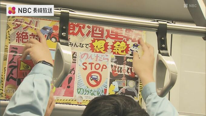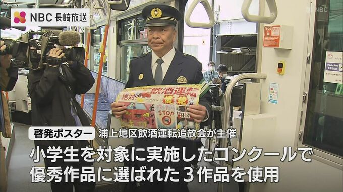 浦上警察署から長崎市内を走る路面電車を運行する「長崎電気軌道」に贈られたのは、飲酒運転の根絶を呼びかける啓発ポスターです。ことしの夏、浦上地区の小学生を対象に行われた「ポスターコンクール」で、優秀作品に選ばれたものが使われています。