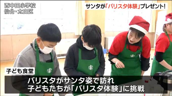 仙台市太白区にある西中田小学校で開かれた子ども食堂には、近隣のコーヒーショップで働くバリスタなどがサンタ姿で訪れ、集まったおよそ50人の子どもたちがバリスタ体験に挑戦しました。