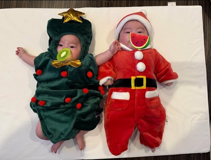 翔子さんは「メリークリスマス」と、ツリーとプレゼントとサンタクロースの絵文字を添えて挨拶。「双子と初めてのクリスマス」「サンタさんともみのき!」と、キウイフルーツのマークを着けた弟くんにはクリスマスツリーの着ぐるみを、スイカのマークを着けたお兄ちゃんにはサンタクロースの衣装を着させて、自身との3ショットや双子の2ショットを複数投稿しました。