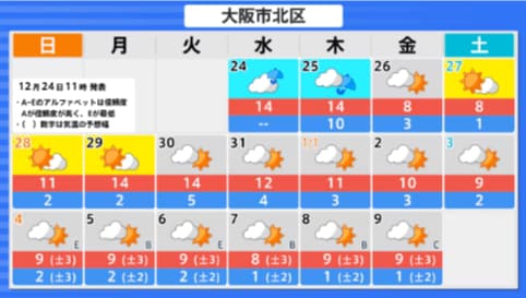 近畿地方は低気圧や前線の影響で、クリスマスイブの24日(水)は広い範囲で雨が降っています。クリスマスの25日(木)にかけて雨が降ったり止んだりの天気で、雷を伴うところがある見込みです。クリスマスのイルミネーションなどの外出は傘が手放せない天気となりそうです。ただ雨の割には気温が高めで、大阪の日中の最高気温は24日(水)が15度、25日(木)14度の見込みです。