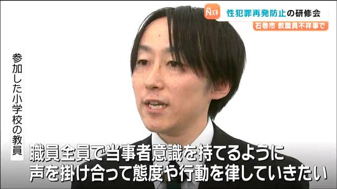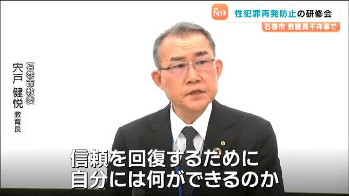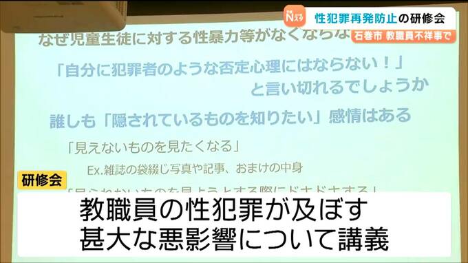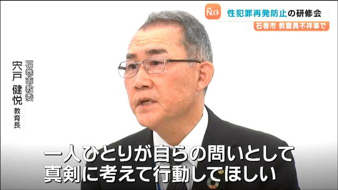 宮城県石巻市内の小学校に勤務する男性教諭が性犯罪で相次いで逮捕されたことを受け、石巻市教委は24日、再発防止を目的とした教職員の研修会を開きました。