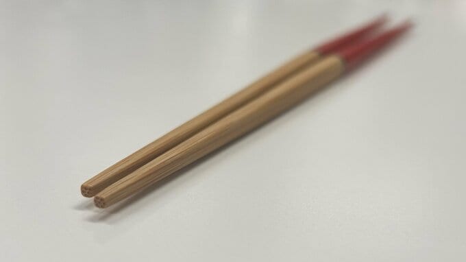 ヤマチクの祝箸をよく見ると、色がついている箸先は丸く、色がついていない、実際に口に運ぶ側の箸先は四角くなっていて、実際に人が食べやすいように設計されていることもわかります。