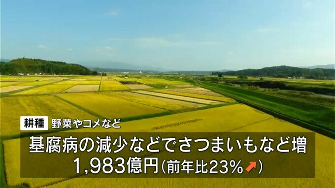 このほか、基腐病の減少でさつまいもの生産量が増加したことなどで、野菜やコメなどの「耕種」が前年比23%増の1983億円と大きく伸ばしています。