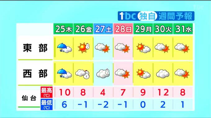 26日は西部を中心に雪が降り、西風が強まって東部では警報級の風となる可能性があります。その後は東部を中心に晴れ間の出る日が多いでしょう。気温の変化が大きく、土曜日は寒さが厳しくなりそうです。