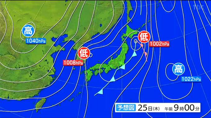 25日午前9時の予想天気図です。前線を伴った低気圧が三陸沖に抜けますが、別の低気圧が日本海に発生するため25日も全国的に雨の降る所が多いでしょう。
