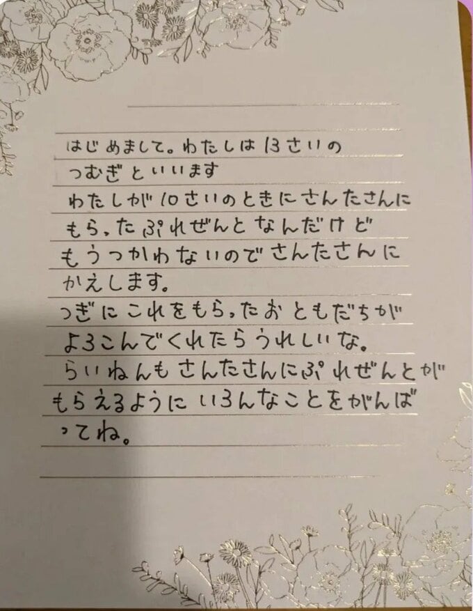 はじめまして。わたしは13さいのつむぎといいます。わたしが10さいのときにさんたさんにもらったぷれぜんとなんだけど もうつかわないのでさんたさんにかえします。つぎにこれをもらったおともだちがよろこんでくれたらうれしいな。らいねんもさんたさんにぷれぜんとがもらえるように いろんなことをがんばってね。