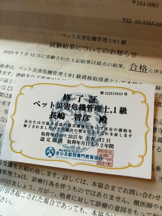 お笑いコンビ「ダーリンハニー」の長嶋トモヒコさんが12月24日、自身のXを更新し、『ペット災害危機管理士1級』の資格取得を発表しました。長嶋さんは、2025年7月12日に同資格を取得しており、手元に届いた修了証(認定証)の写真とともに喜びの声を投稿しています。