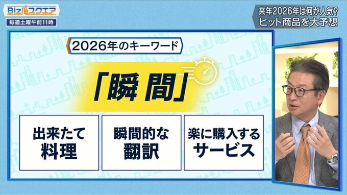 「加速する社会の中において“瞬間”というのがテーマであるなという印象。例えば出来たて料理。コンビニで出来立てほかほかを食べられるものが増えてくる。食事はささっと済ませて色々やりたいから完全栄養食とかも増えている。あとはAIの実装が進み、翻訳も買い物も“瞬間的”に完結するサービスが当たり前になる。情報が多くて決められなくても、自分に合ったものをサッと選んでくれて楽に購入できるとか」