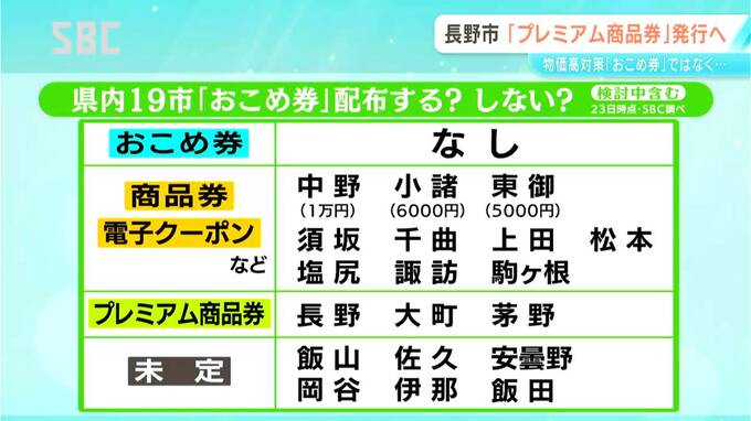 具体的には10の市が「商品券や電子クーポン」を予定。中野市は全ての市民に1万円の商品券を配布します。長野市のような「プレミアムつき商品券」を検討しているのは大町市と茅野市。6つの市は未定としています。