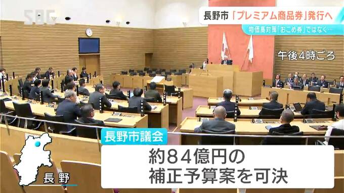 長野市議会は24日の臨時会で市が提出したおよそ84億円の補正予算案を可決しました。このうちの63億円余りは「プレミアム付き商品券」の事業費。
