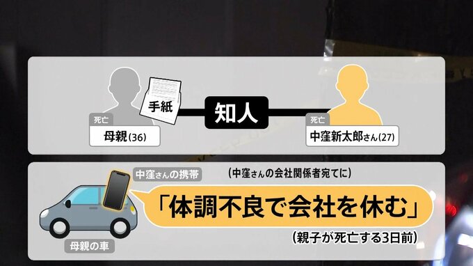 また、母親の車の中からは中窪さんの携帯電話が発見されました。その携帯電話からは親子が死亡する3日前、「体調不良で会社を休む」というメッセージが送られていたということです。