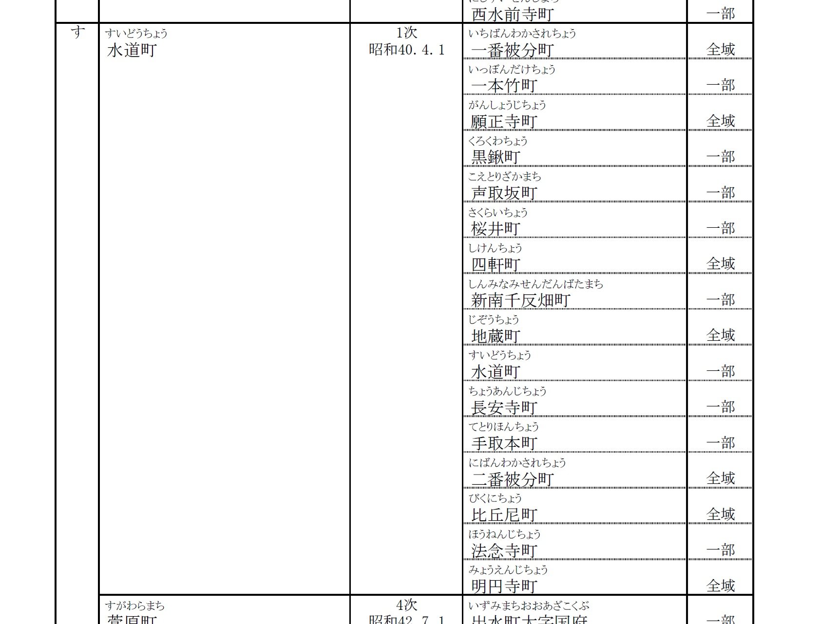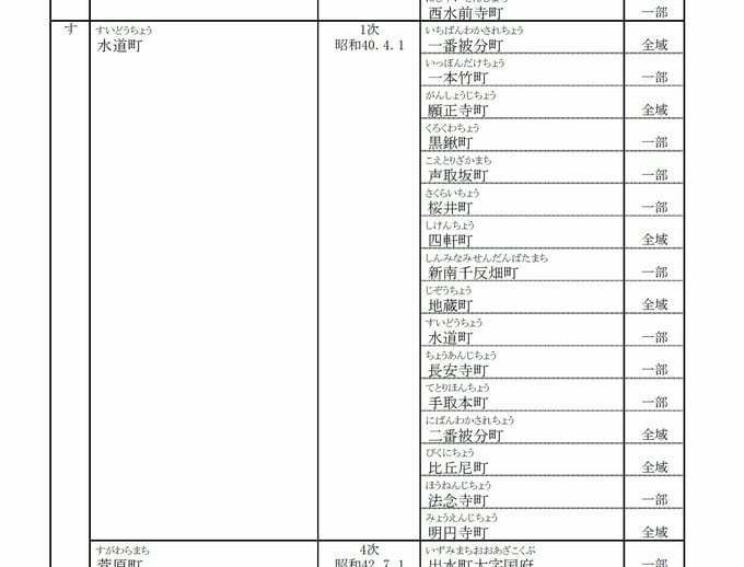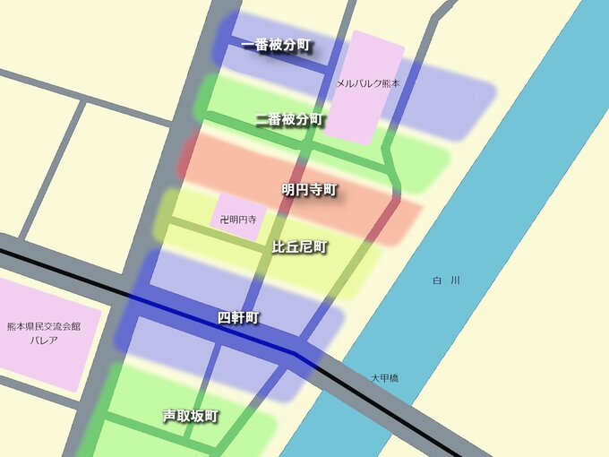熊本市が公開しているリストには、現在の水道町にかつてあった町名として、「明円寺町」「一番被分町(いちばんわかされちょう)」「黒鍬町(くろくわちょう)」といった耳慣れない名が並んでいます。