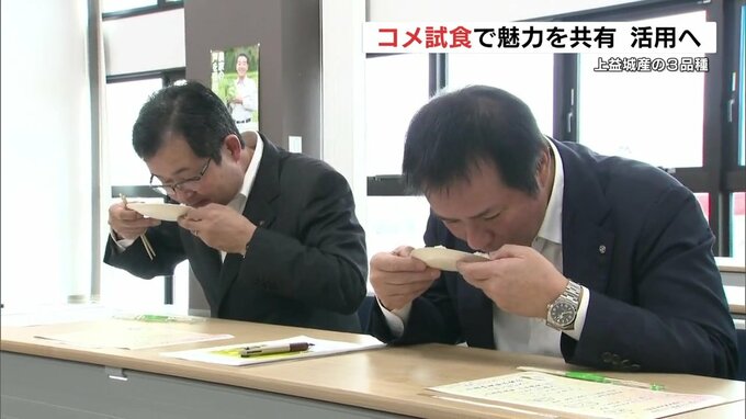 出席した5つの町の町長やコメの卸業者たちが、上益城産の「コシヒカリ」など3つの品種を試食してPRしました。