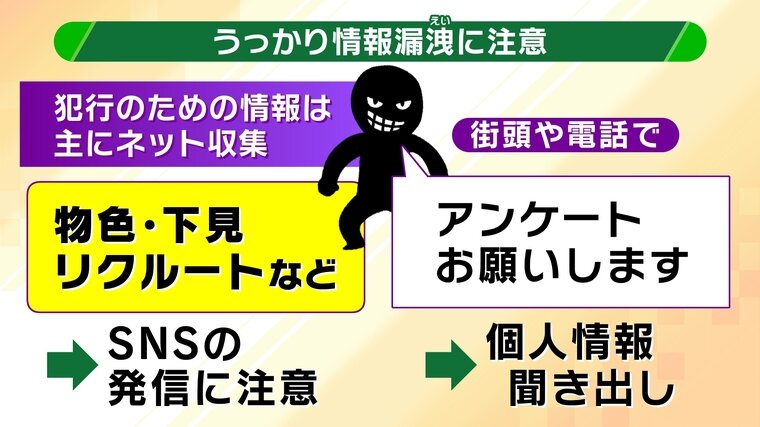 また、“うっかり情報漏えい”にも要注意。物色・下見・リクルートなど、犯行のための情報は主にネットで収集されるため、SNSの発信には気をつける必要があります。街頭や電話でのアンケートから、個人情報を聞き出されることも。