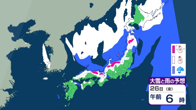 警報級の大雪:西日本では26日、北〜東日本では26日から27日にかけて、大雪による交通障害に警戒が必要です 。特にJPCZがかかる地域では短時間で積雪が急増し、平地でもまとまった雪となる可能性があります。