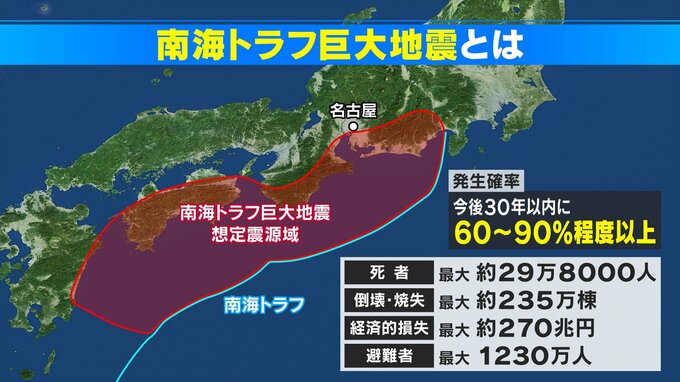 南海トラフ沿いでは今後30年以内にマグニチュード8から9の巨大地震が「60から90%程度以上」の確率で起きると予測されています。最大震度は7。太平洋沿岸の広い地域で10メートル以上の大津波が来ることが想定され、死者は最大で29万8000人にのぼる想定です。