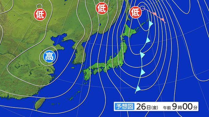 【雨雪情報】年末年始は荒天「強烈寒気」で日本海側は大雪に警戒→帰省ラッシュに影響【気象庁 発表】 RSK山陽放送 2025年12月25日(木) 12:10 国内 天気 気象庁によりますと、日本付近は強い冬型の気圧配置となる見込みで、北日本から西日本ではあす(26日)は、暴風や暴風雪、高波、大雪による交通障害に警戒するよう呼び掛けています。 【画像①】はあす(26日)午前9時の予想天気図です。 【画像①】