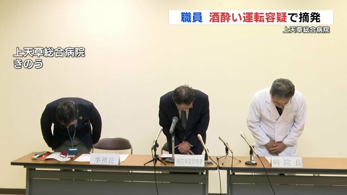 熊本県上天草市は、市立の上天草総合病院の職員が飲酒運転で自損事故を起こし、摘発されたと発表しました。市によりますと、上天草総合病院に勤務する職員は12月22日夜、天草市内の飲食店で酒を飲み、近くのホテル…