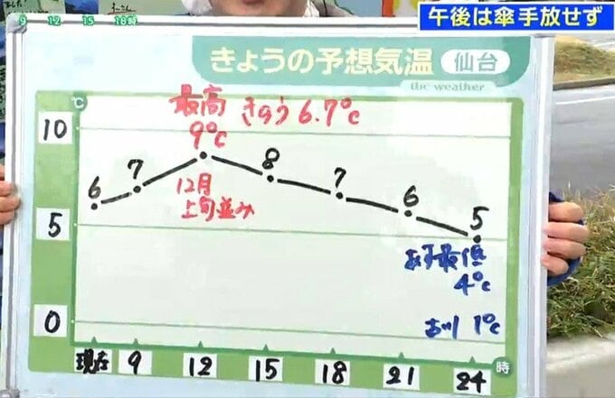 最高気温は24日よりも2度前後高くなり、高いところでは10℃前後まで上がる予想です。上空の寒気が弱いため、仙台で9℃など、24日より2度前後高く、平年よりも少し高めとなりそうです。