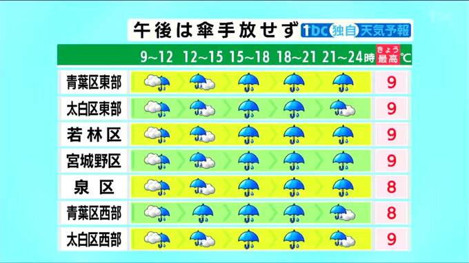 ■太白区東部:最高気温9℃ ■太白区西部:最高気温9℃