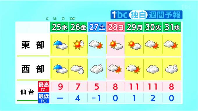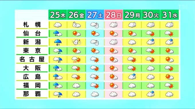 27日土曜日も西部の山沿いを中心に雪が降りやすいですが、その後は東部を中心に晴れ間の広がる日が多いでしょう。