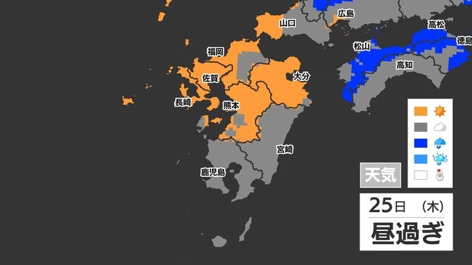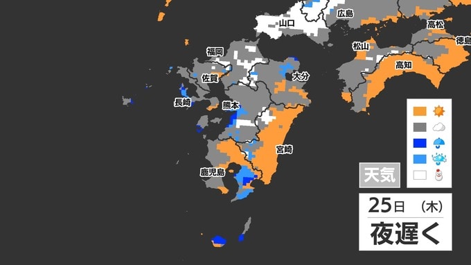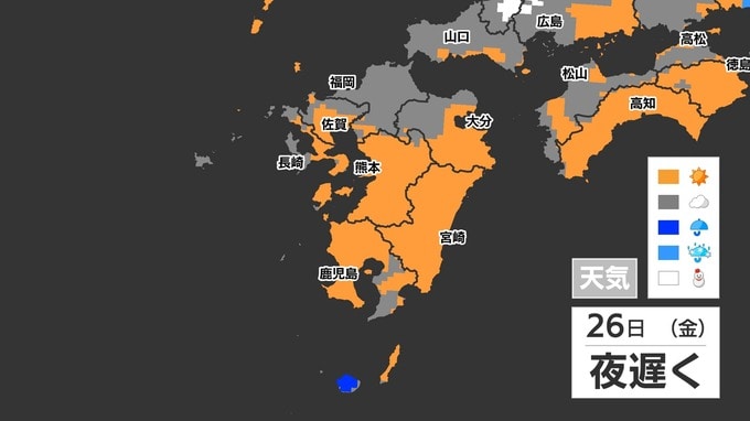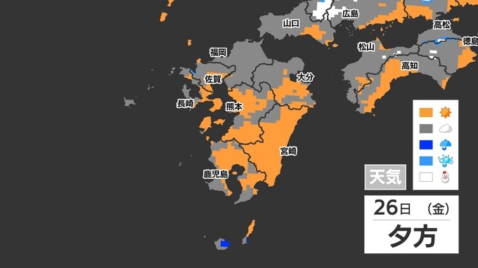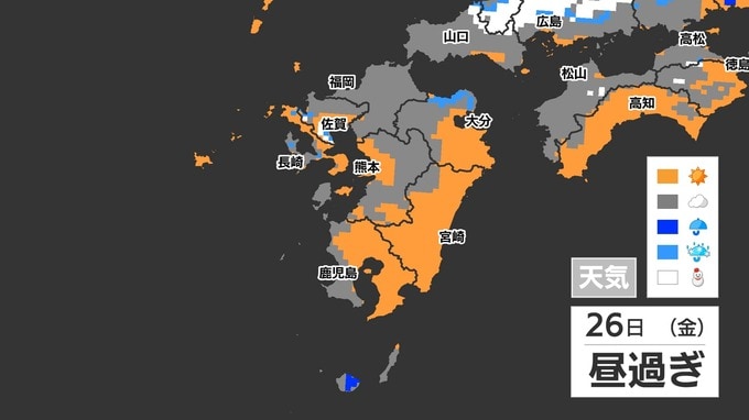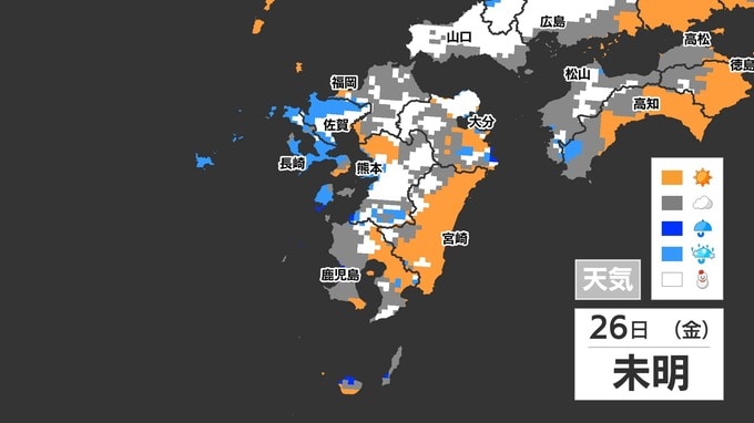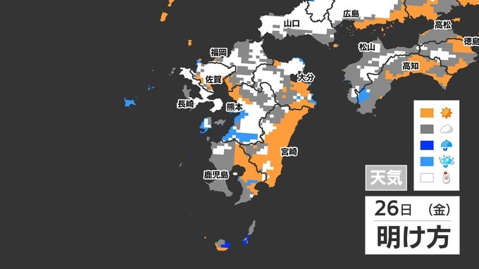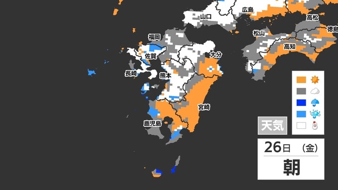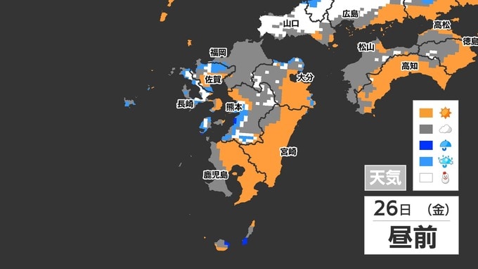 九州地方の天気傾向をメッシュ予報で掲載しています。オレンジ=晴れ、グレー=くもり、青=雨、水色=みぞれ、白=雪を表しています。