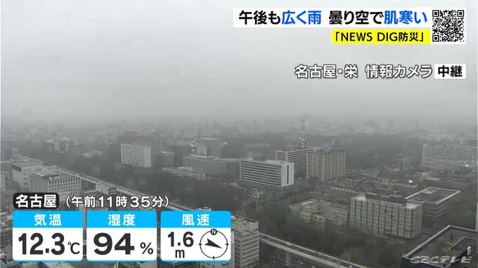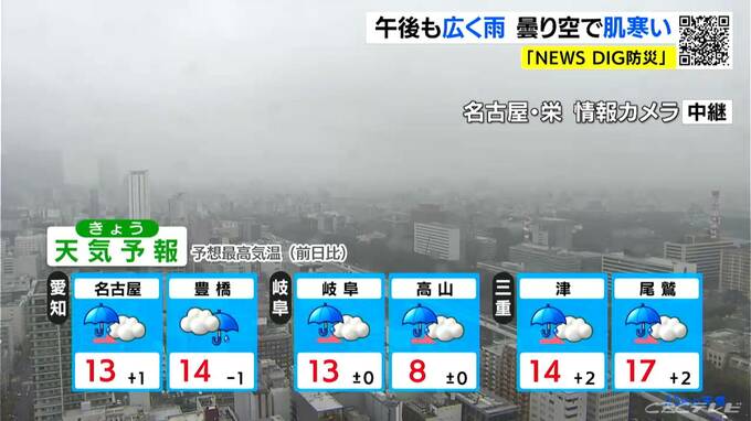 きょうは、午後も広く雨が降るでしょう。最高気温は、名古屋や岐阜で13℃、豊橋や津では14℃の予想で、日差しが届かず日中も肌寒くなりそうです。