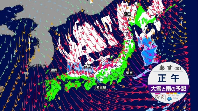 あすは強い冬型の気圧配置になり、上空に寒気が流れ込む見込みです。山陰から北陸、北日本の日本海側で広く雪が降り、雪が強まる所があるでしょう。山沿いや内陸を中心に雪の量が多くなり、平野部でも積雪となりそうです。また、風も強く吹雪く所があるため、交通障害にご注意ください。