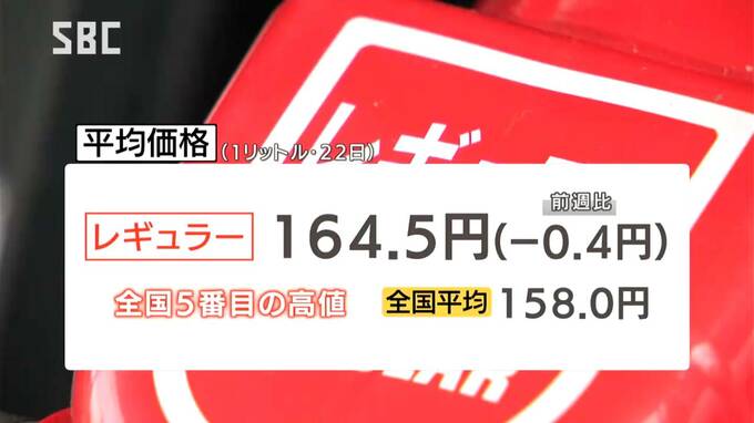 石油情報センターによりますと、22日時点の県内のガソリンの平均価格は、レギュラー1リットルあたり164.5円で、先週から0.4円下がりました。