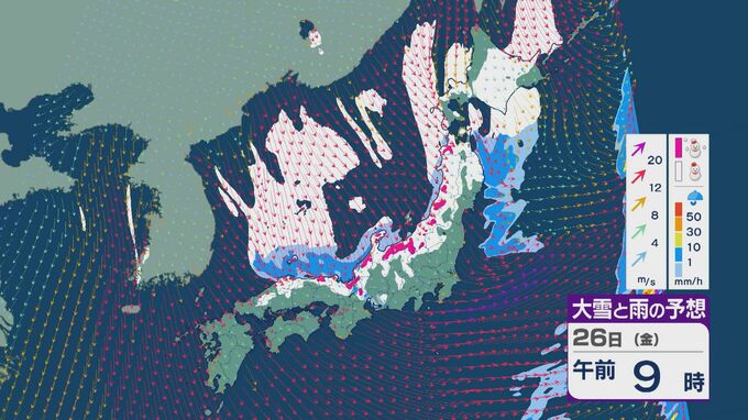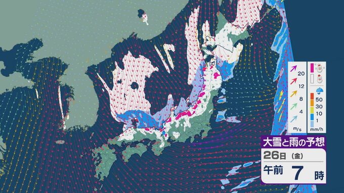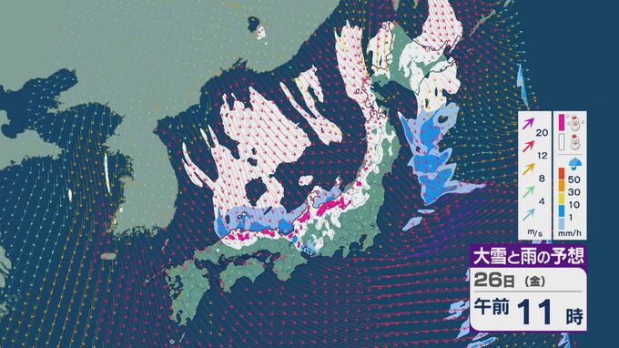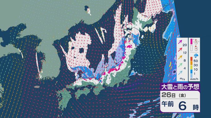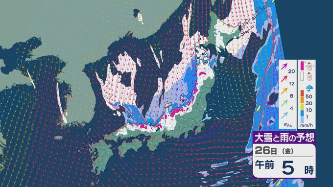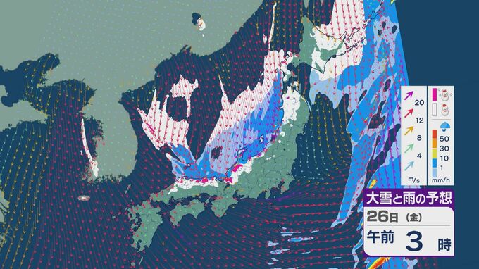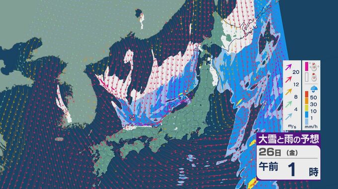 雪の降りやすい状況で、26日の雪・雨と風の予想を見ると、未明からは日本海の西部で風が収束して発生、発達した雪雲が山陰や近畿に流れ込みそうです。