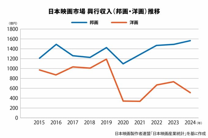 日本の映画興行市場での邦画と洋画それぞれの興収をグラフにしてみた。