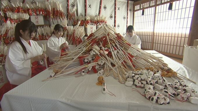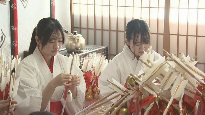 邪気を払い、幸運を射止めるとされる縁起物の破魔矢。4人の巫女が、五穀豊穣や商売繁盛の願いが込められたひょうたんや、来年の干支・午(うま)の張り子を取り付けていました。