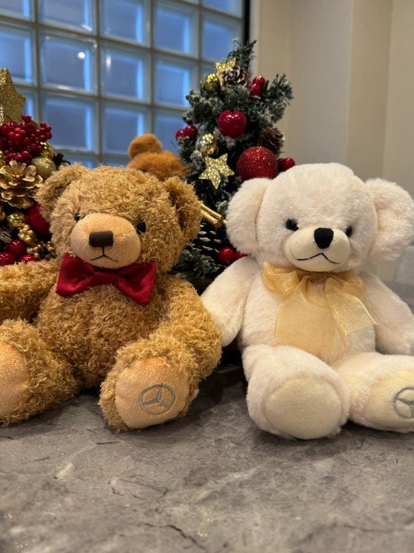 続けて、白いテディベアのぬいぐるみと並べた画像を添えて、「ちなみに昨年のベアと、並べて置きました。」「ペアとなったベア。毎年いただいておりますので、結構な数になってきました。」と、毎年、愛車・ベンツの担当者からテディベアをプレゼントされていることを綴っています。