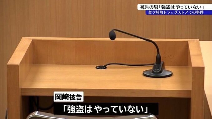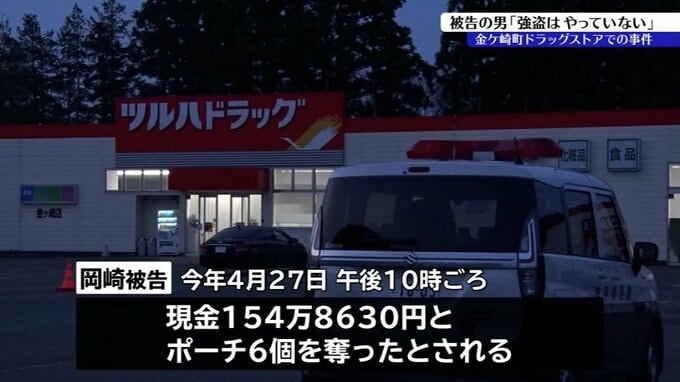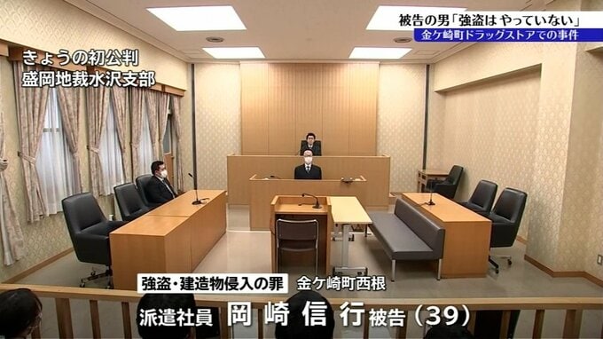 強盗と建造物侵入の罪に問われているのは、金ケ崎町西根の派遣社員・岡崎信行被告39歳です。起訴状などによりますと岡崎被告は4月27日の午後10時ごろ、閉店作業中の自宅近くのドラッグストアに侵入し、女性店長と男性従業員の2人に包丁を突き付け「金を出せ」などと脅し、現金154万8630円とポーチ6個を奪ったとされています。岡崎被告は初公判で起訴内容に間違いがないか問われると、「強盗はやっていない」と述べました。