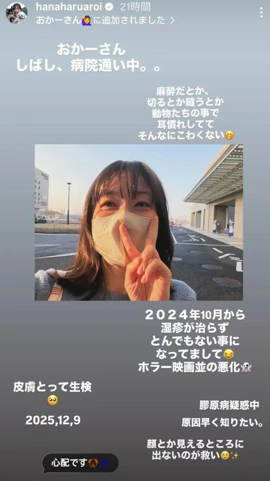続けて「皮膚とって生検 2025,12,9」「膠原病疑惑中 早く原因知りたい。」「顔とか見えるところに 出ないのが救い」と、状況を明かしていました。
